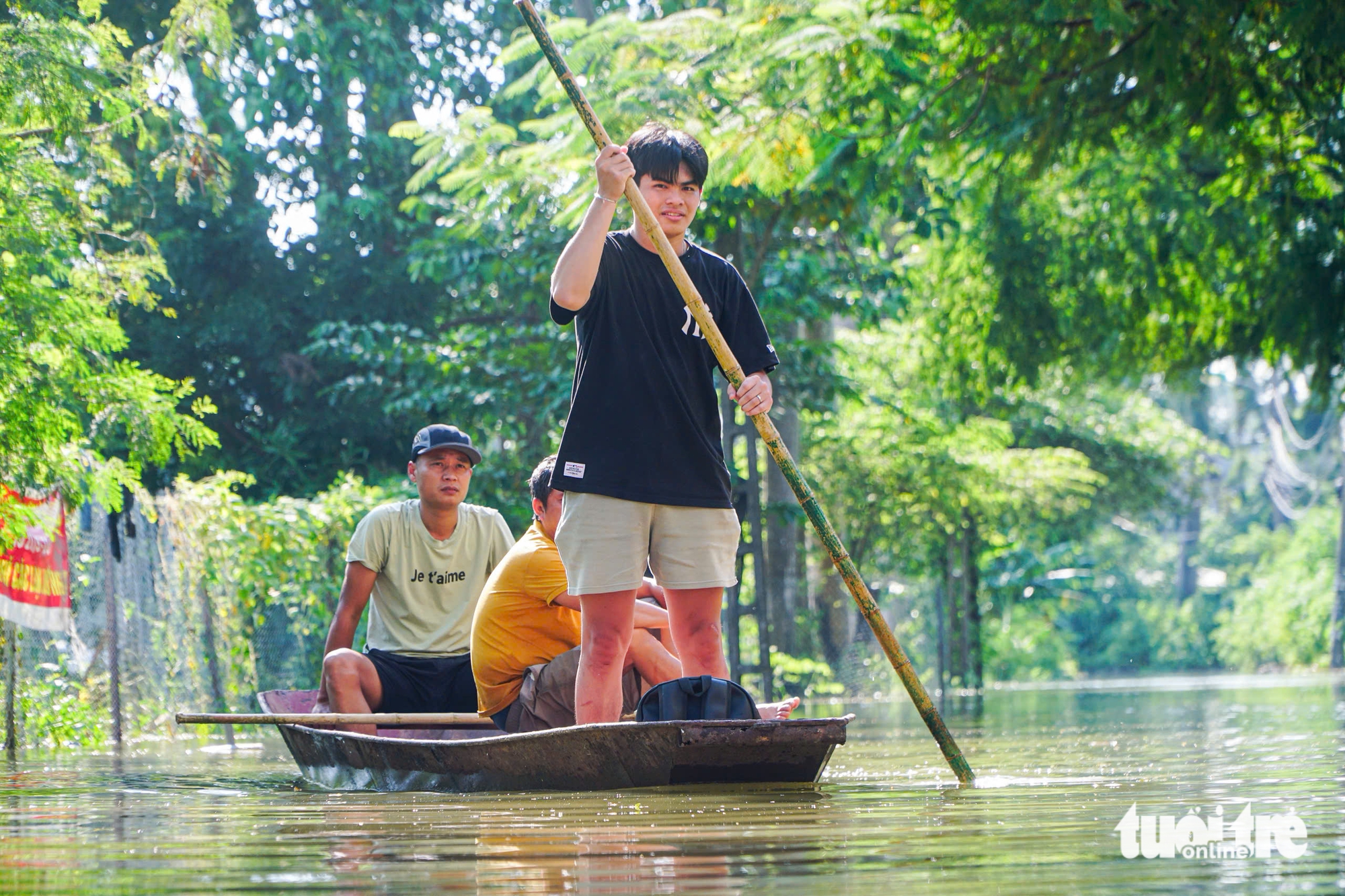 Đường ngập sâu, nhiều người dân phải di chuyển bằng thuyền - Ảnh: PHẠM TUẤN