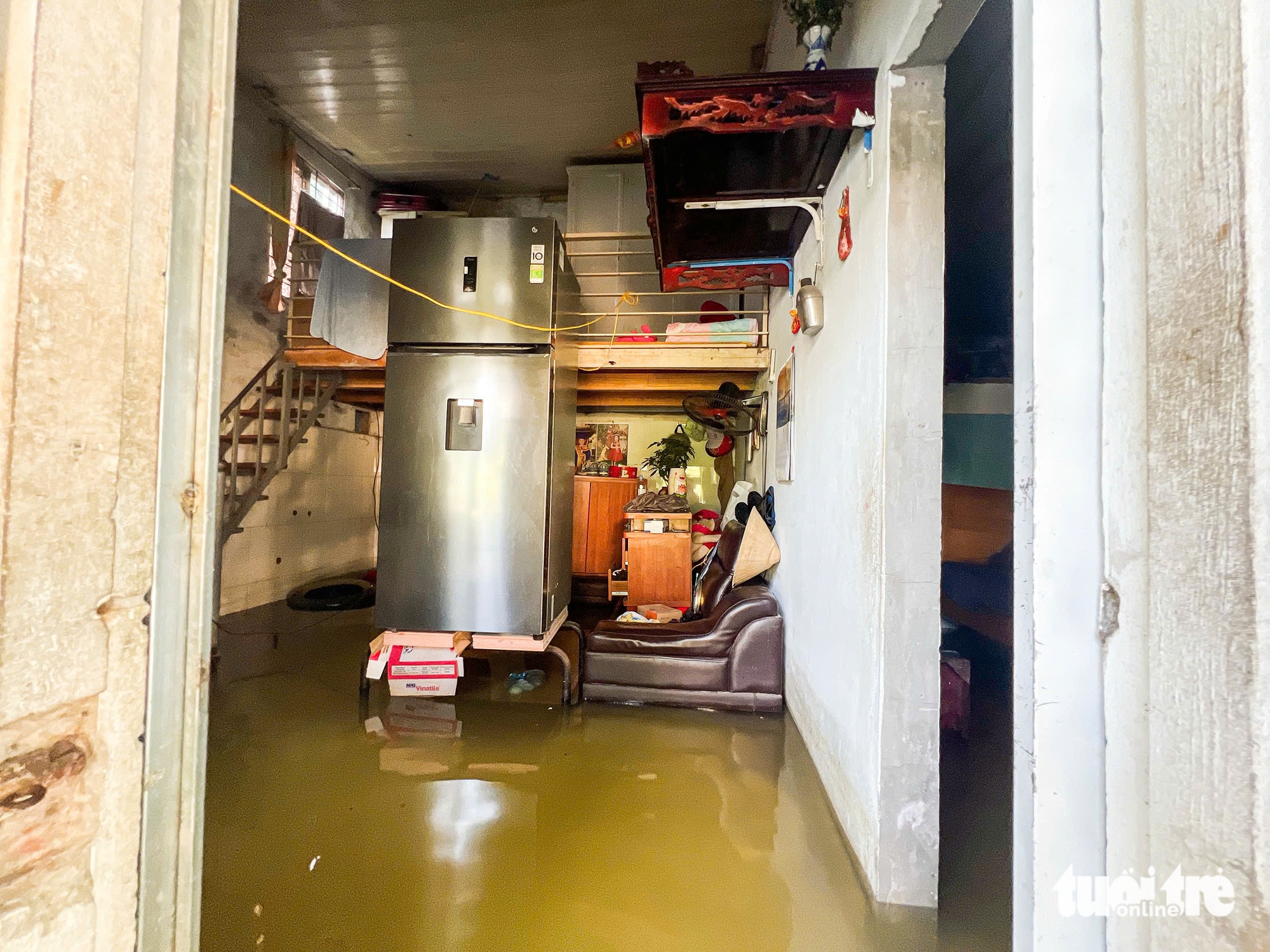 Một hộ dân kê cao tủ lạnh để tránh hư hại do nước ngập - Ảnh: PHẠM TUẤN