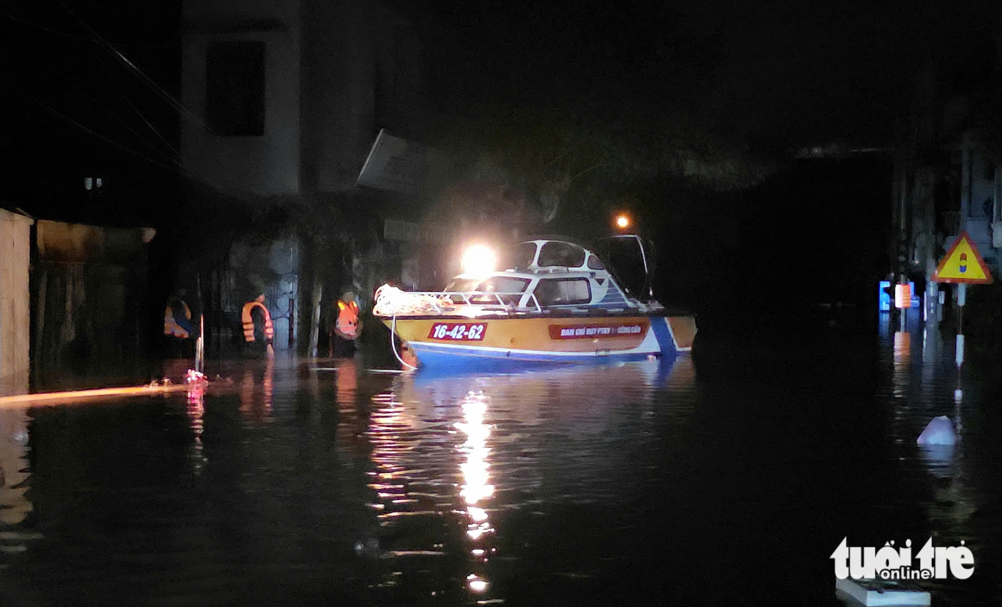Lực lượng chức năng dùng ca nô để hỗ trợ các vùng ngập sâu tại xã Đồng Xuân rạng sáng nay 7-11 - Ảnh: MINH CHIẾN