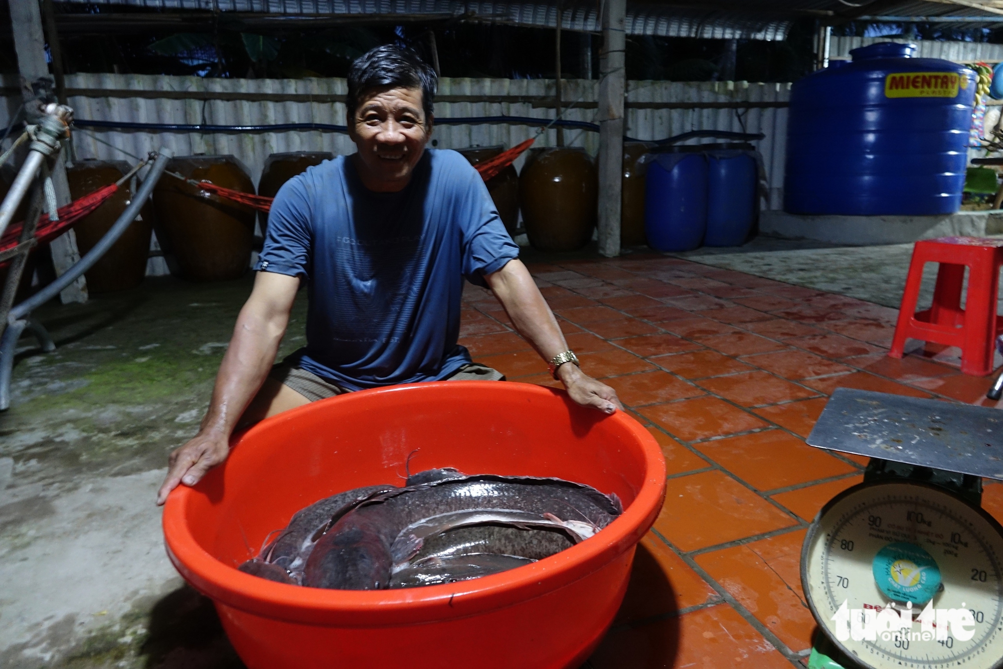 Con cá trê khủng được anh Đà cân và có cân nặng khoảng 8kg