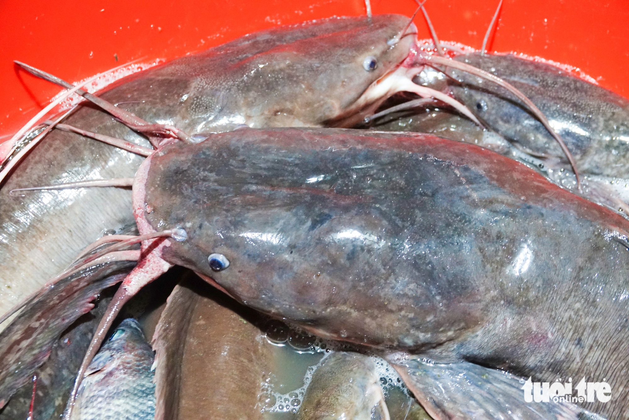 Có con cá trê to với bề ngang đầu cá bự mà gang tay người lớn ôm không hết, dài gần 1m, nặng khoảng 8kg. Ngoài ra có con cá trê màu trắng hồng, nặng khoảng 2kg nhìn rất đẹp và lạ mắt.