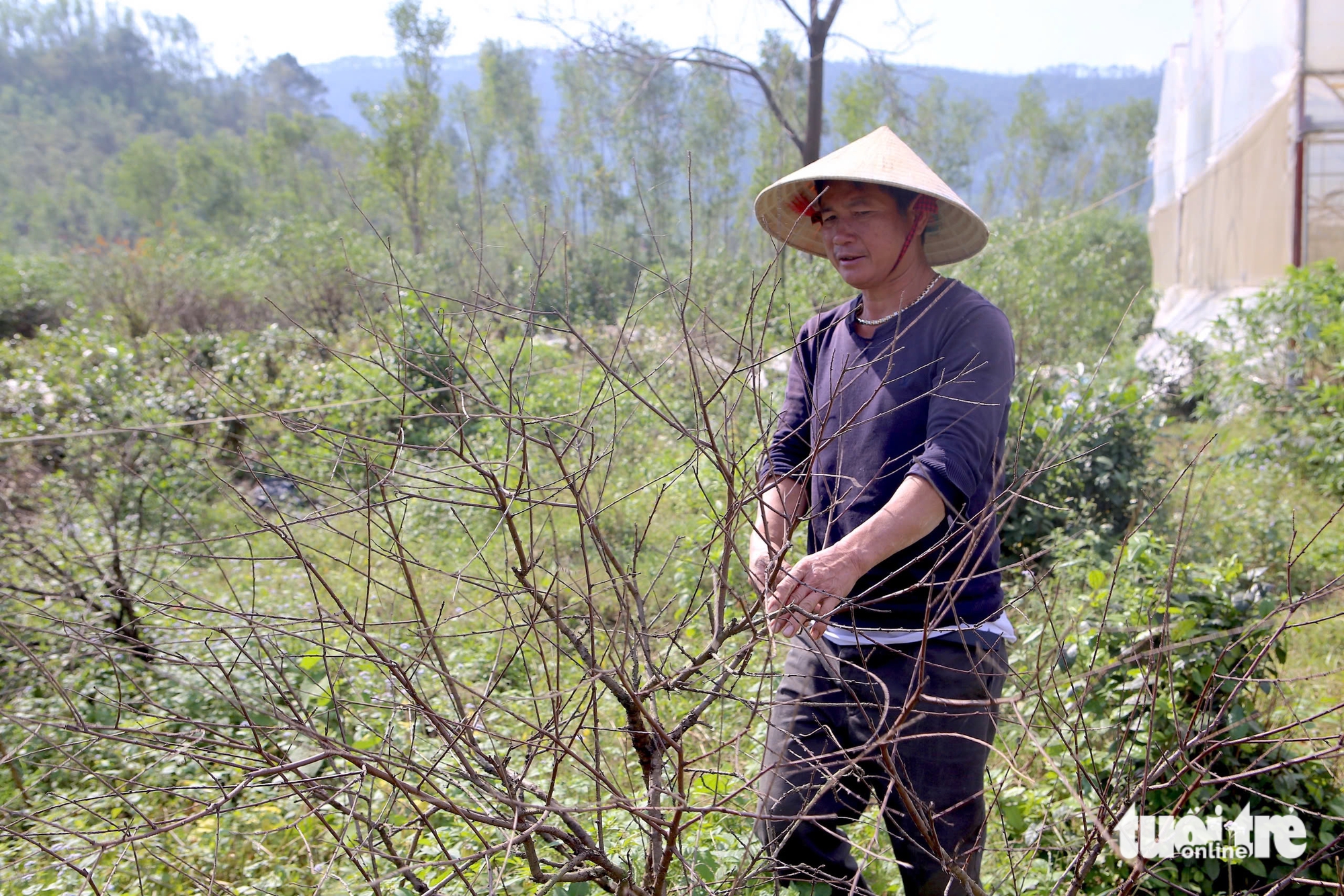 Gia đình ông Hựu trồng hơn 100 gốc đào loại 2-3 năm tuổi nhưng đã có hàng chục cây chết, héo úa. Những cây sống cũng chưa có dấu hiệu trổ hoa, khiến gia đình ông rất lo khi Tết Nguyên đán chỉ còn vài tháng nữa.
