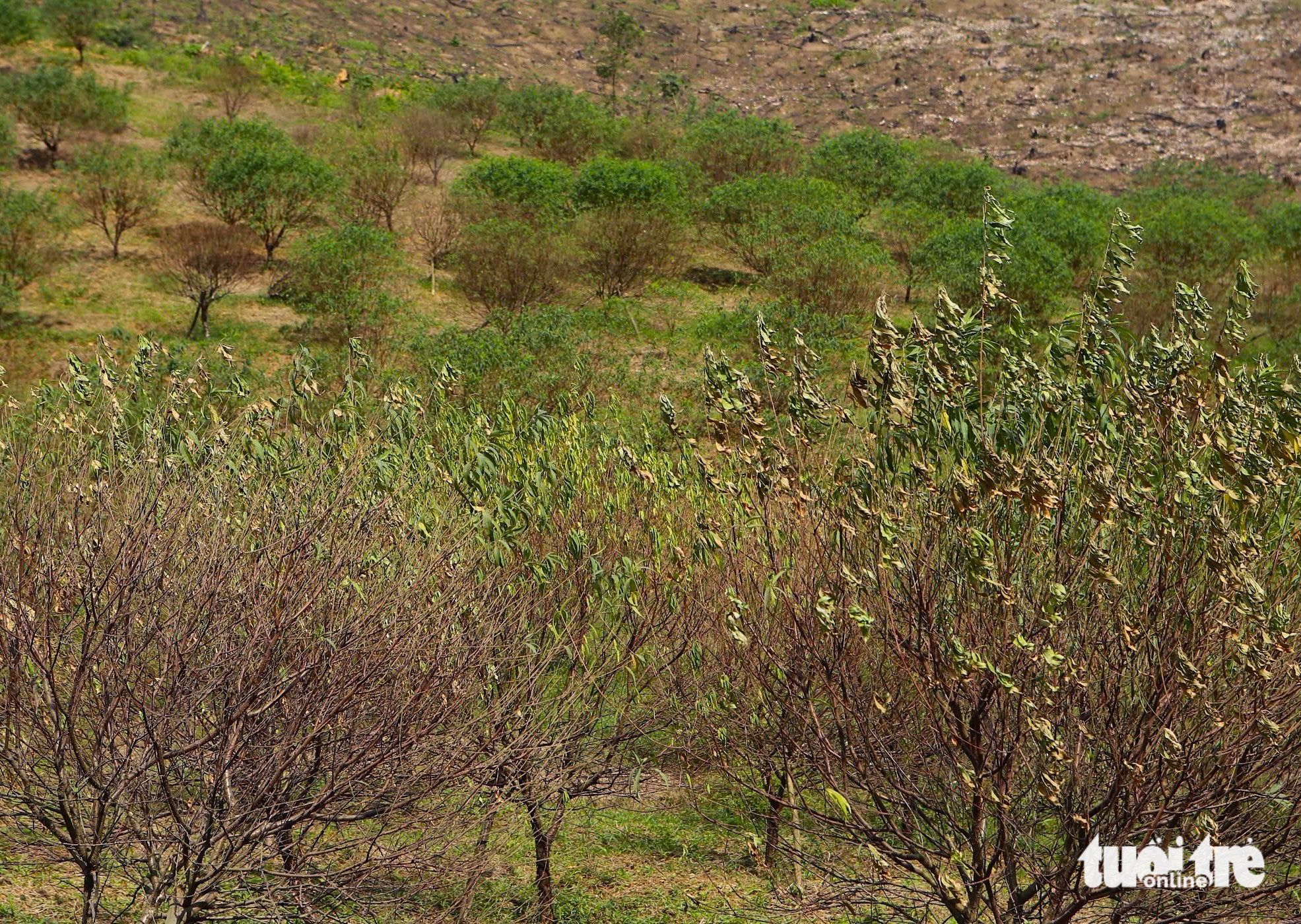 Men theo con đường liên xã phóng tầm mắt lên các quả đồi, dễ dàng nhìn thấy cây đào chết khô, khiến những ngọn đồi vốn xanh tươi giờ trở nên lốm đốm màu vàng úa.