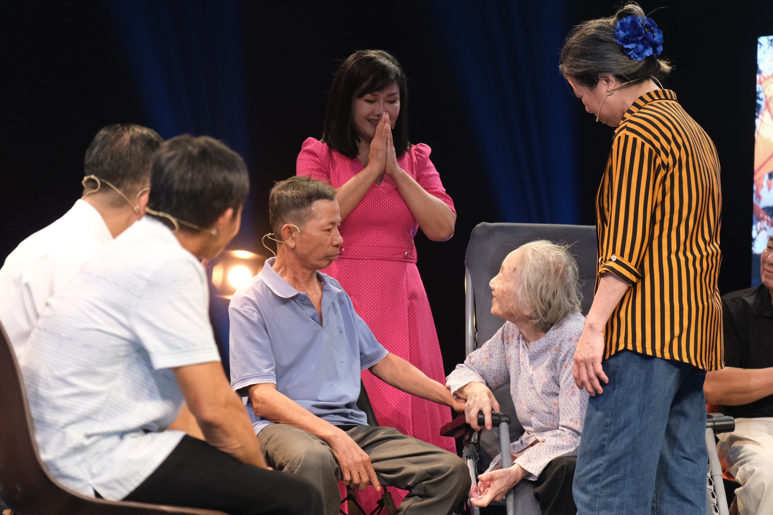 Lúc lên sân khấu, nhìn ông Hải, bà Thật thốt lên: "Ôi Cu Tí sao giờ già vậy. Cho má sờ cái tai coi. Con coi có phải má của con đây không, phải cái bà bưng thúng bánh mì đi bán không? Đúng hả?". Mọi người bật cười vì sự "hồn nhiên" của bà mẹ 93 tuổi.