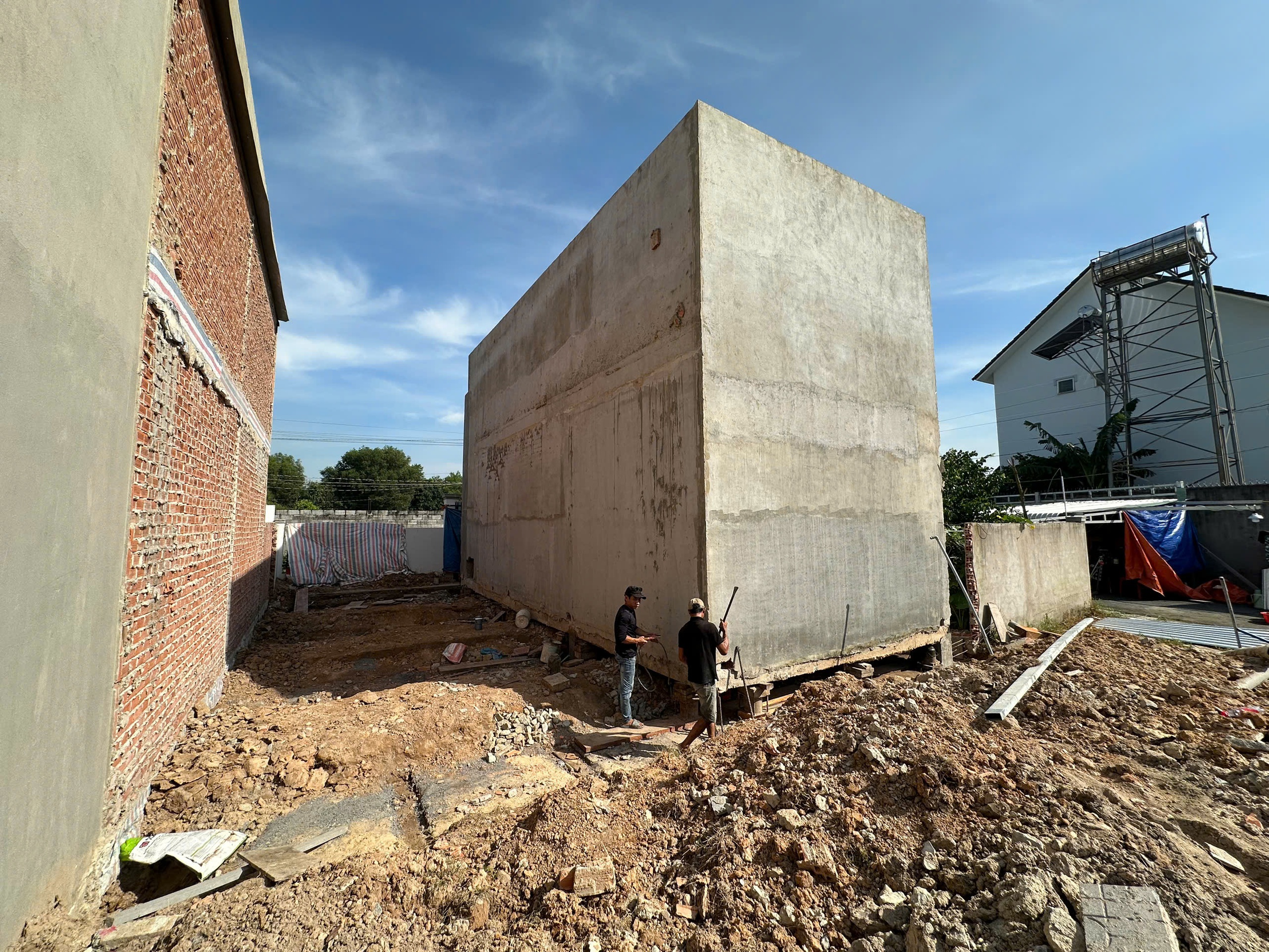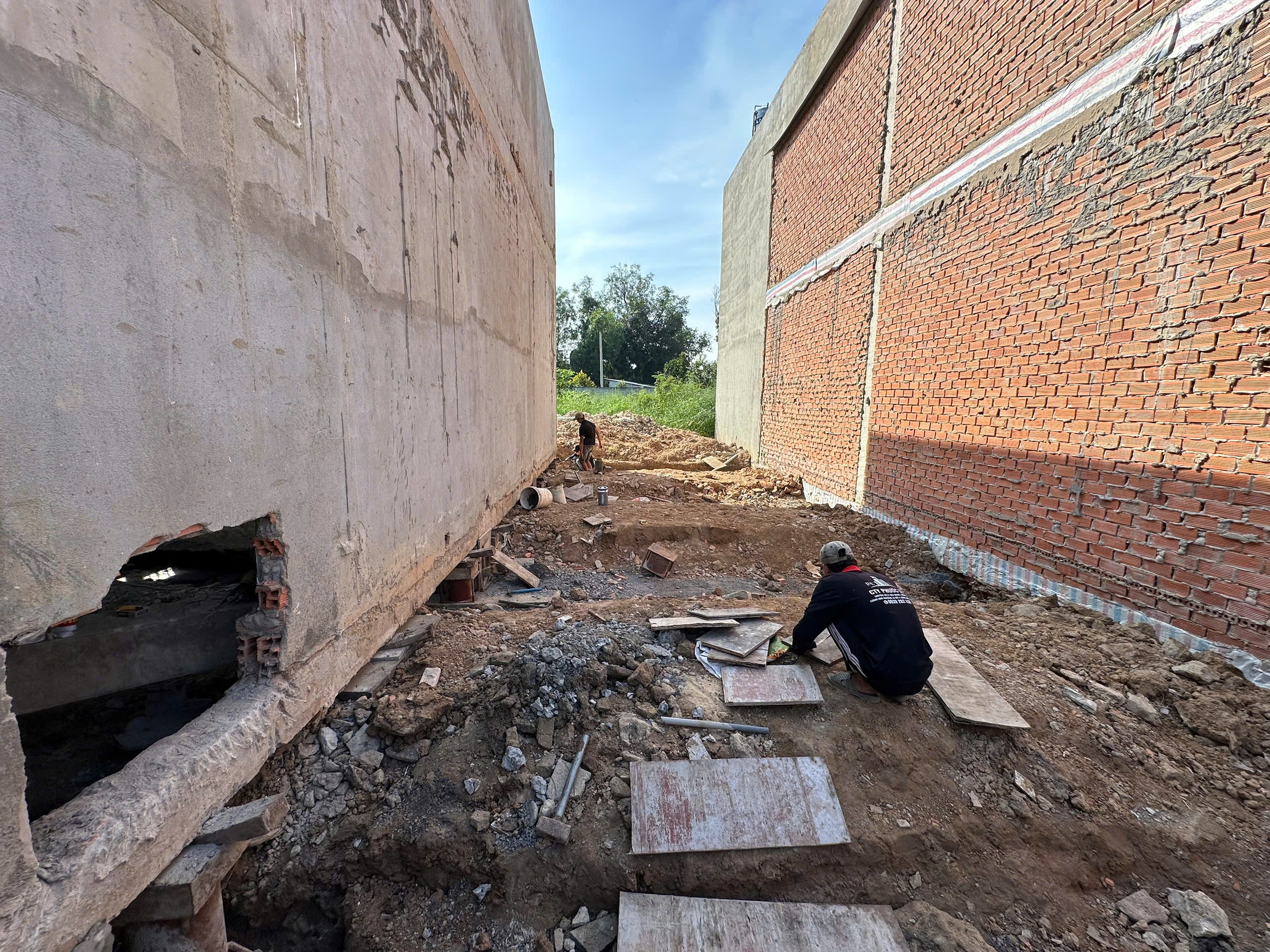Các "thần đèn" thi công lại phần móng nhà sau khi di dời xong (ảnh chụp ngày 18-10) - Ảnh: B.SƠN