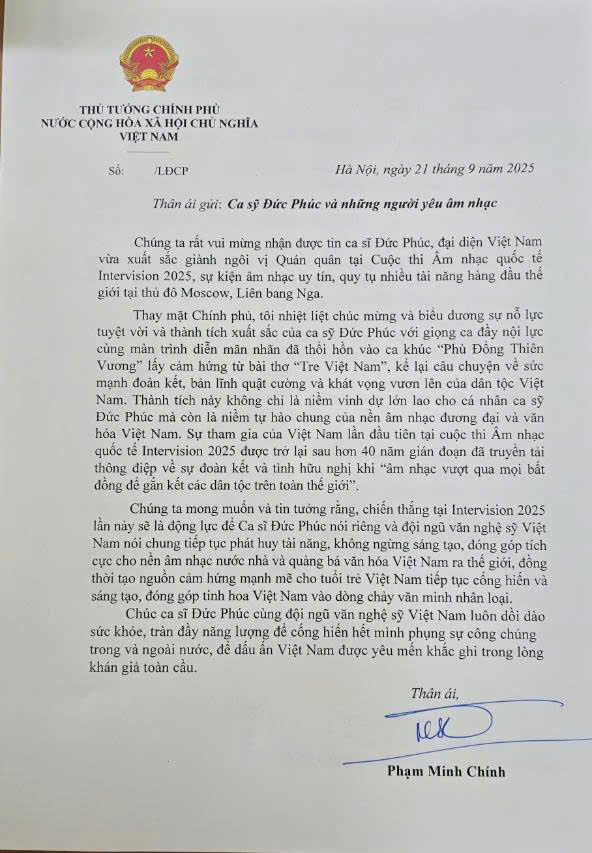 Thành tích này không chỉ là niềm vinh dự lớn lao cho cá nhân ca sĩ Đức Phúc mà còn là niềm tự hào chung của nền âm nhạc đương đại và văn hóa Việt Nam’, thư của Thủ tướng Phạm Minh Chính viết ngợi khen ca sĩ Việt chiến thắng Intervision 2025.